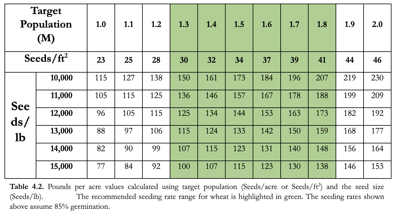 Use the following table from the Small Grain Production Guide to assist in selecting your population before planting and converting that population to seeds/acre to plant. Most growers should start with a population of 1.5 to 1.6 million seeds per acre in their optimum planting window and increase the population as the planting season progresses. A few areas of the state will start with very low populations (1.3-1.4 million seeds/acre) very early in the window. These growers maintain a higher intensity of management throughout the season to manage high yield from a lower population.