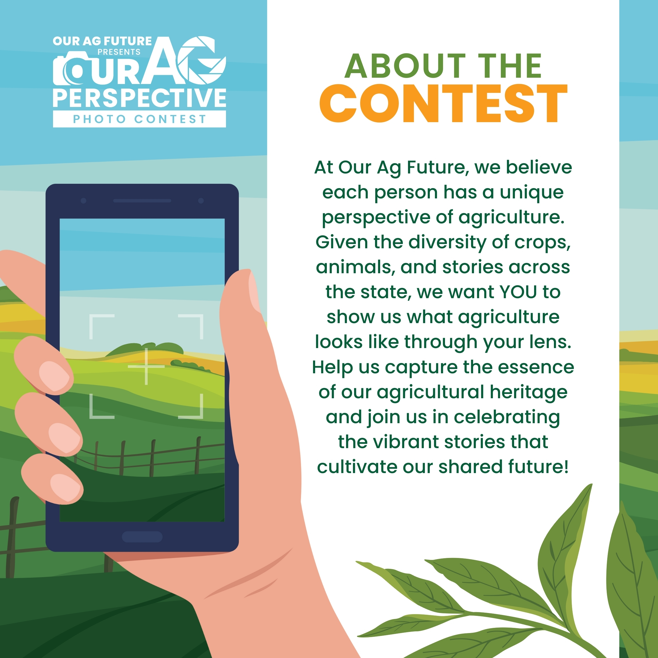 At Our Ag Future, we believe each person has a unique perspective of agriculture. Given the diversity of crops, animals, and stories across the state, we want YOU to show us what agriculture looks like through your lens. Help us capture the essence of our agricultural heritage and join us in celebrating the vibrant stories that cultivate our shared future!